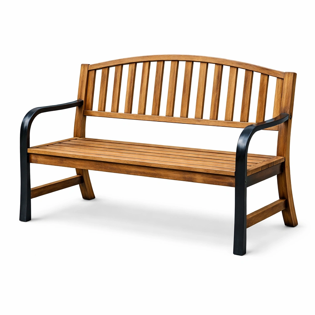 Material: Estructura de madera de acacia, brazos de hierro con acabado en pintura negra.
